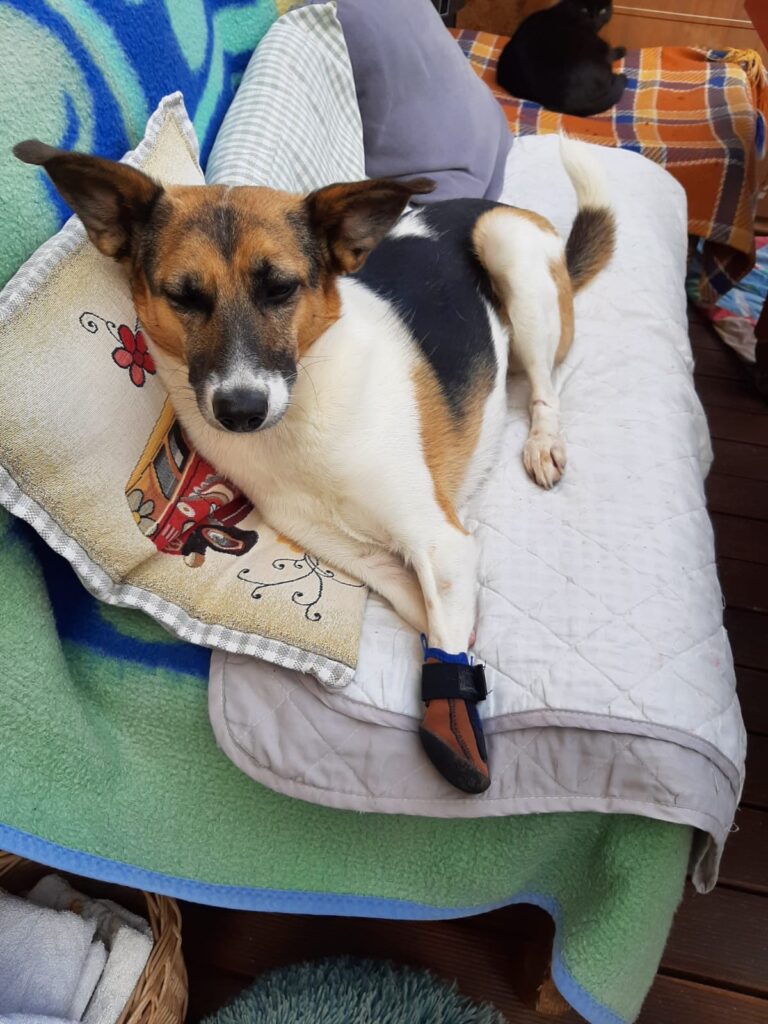 Die monatliche Physiotherapie, die sie aktuell bekommt, sollte unbedingt fortgeführt werden, um ihre Muskulatur in den Vorderbeinen zu erhalten.
